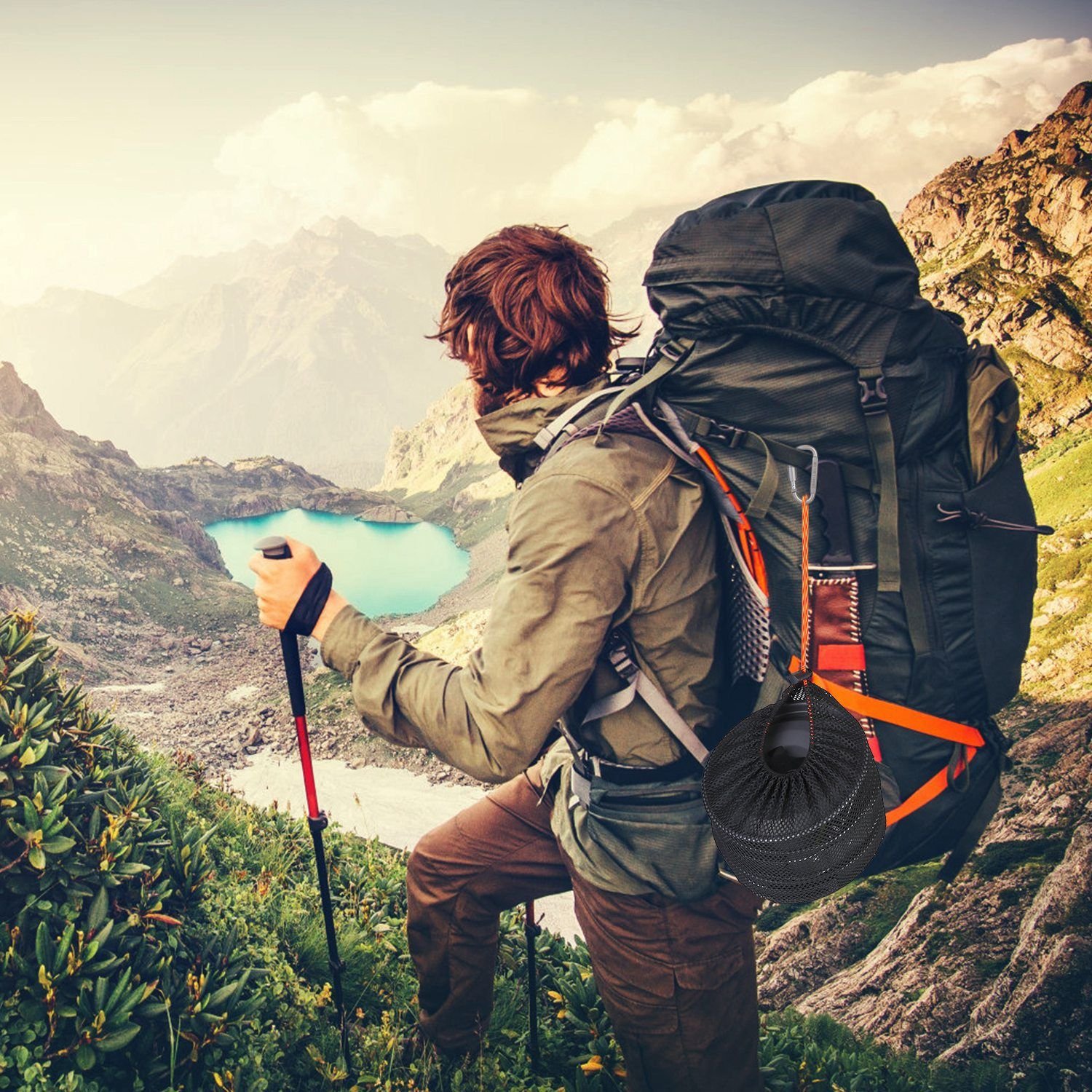 *Portable Design*:All the cooking wares can be stored in a small mesh bag; space-saving and accessible. You can hang it on the backpack with the attached carabiner. Just take it anywhere you go.