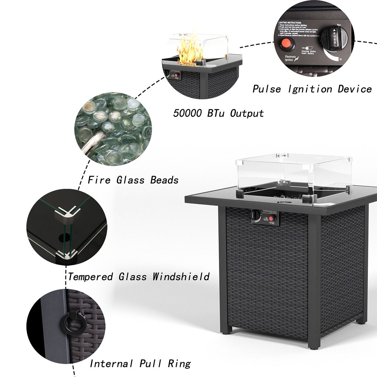 [Perfect Size, Optimal Heat Output]: Measuring at 27.6 "D x 27.6 "W x 24.8 "H, this propane fire pit table is perfectly sized for various outdoor spaces. Outdoor Fireplace with a remarkable 50,000 BTUs of heat output, fire pit table guarantees cozy warmth during chilly evenings and nights. Enjoy the beauty of the flames while staying comfortably warm in your outdoor haven.