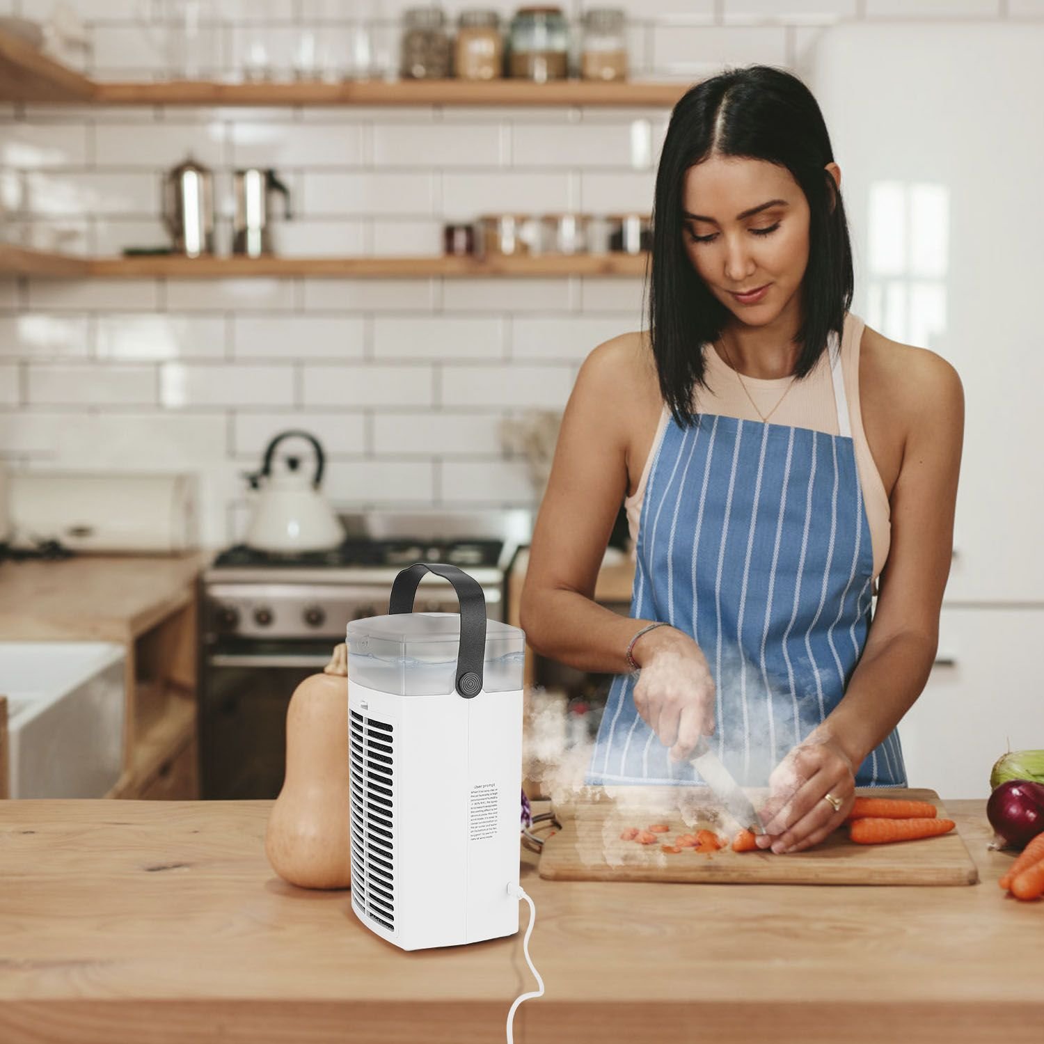 *Efficient Cooling*:This portable air cooler draws in hot air and cools it quickly through evaporative water cooling technology; making you surrounded by humidified and cool air. For better cooling effect; you can add some icy water. You can also freely adjust the flexible air vent to point to the direction you want.