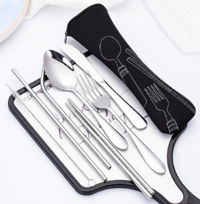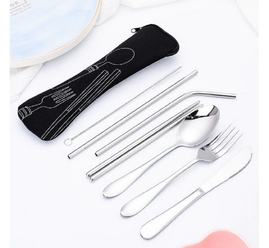 1.Stainless steel cutlery set, spoon, fork, knife, chopsticks, thick straw, thin straw, curved straw, clean brush 8 piece, with mini zipper case for flatware and cotton flannel bag for straw ,easy to carry, nice for traveling camping and other outdoor party.