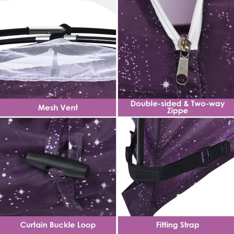 Creative Private Space: This indoor tent is a practical way of having your own space in a shared room. It filters light and provides a warm space at night.A place to Relax & Focus: It is ideal for studying, watching movies, and meditation. It comes with a TPU tablet holder and 2 corner pouches for your mobile phone, keys, etc.Comfortable Sleep Experience: Designed to keep the warm atmosphere inside the tent while allowing the air to circulate through the vents for a comfortable rest. Every 3 doors have a two-way-zipper that allows to access the tent easily.High-quality & Durable Materials: Made from a high quality 190T polyester cloth that is breathable and durable. The fiberglass poles provide stable support and maintain its shape without the risk of sagging.Easy Set-Up and Folding: The tent is easy to assemble and folds up quickly for storage. It comes with a handy bag for easy storage.