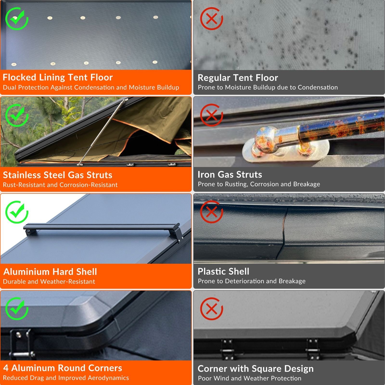 5. [Pop up Overland Rooftop Tent with 5 Seconds to Open and Close] - The hydraulic automatic top tent, easily pop up or put away with rust-resistant&corrosion-resistant stainless steel gas struts in 5 seconds, can be used continuously for many years without losing stability for Truck Jeep SUV Car Van Wrangler Tacoma Minivan.