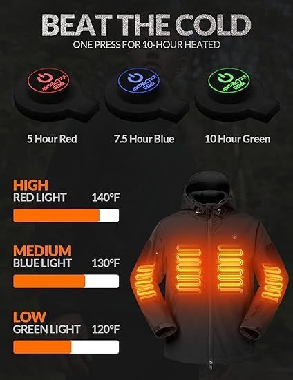 ��THREE HEATING LEVEL & DUAL CONTROL BUTTONS: 3 Heating levels (high, medium, and low). Change the heat setting of your jacket with a simple press of a button. Our battery can work up to 10 hours / 120℉ at a low level, 7.5 hours / 120℉ at a medium level, and 5 hours / 140℉ at a high level.