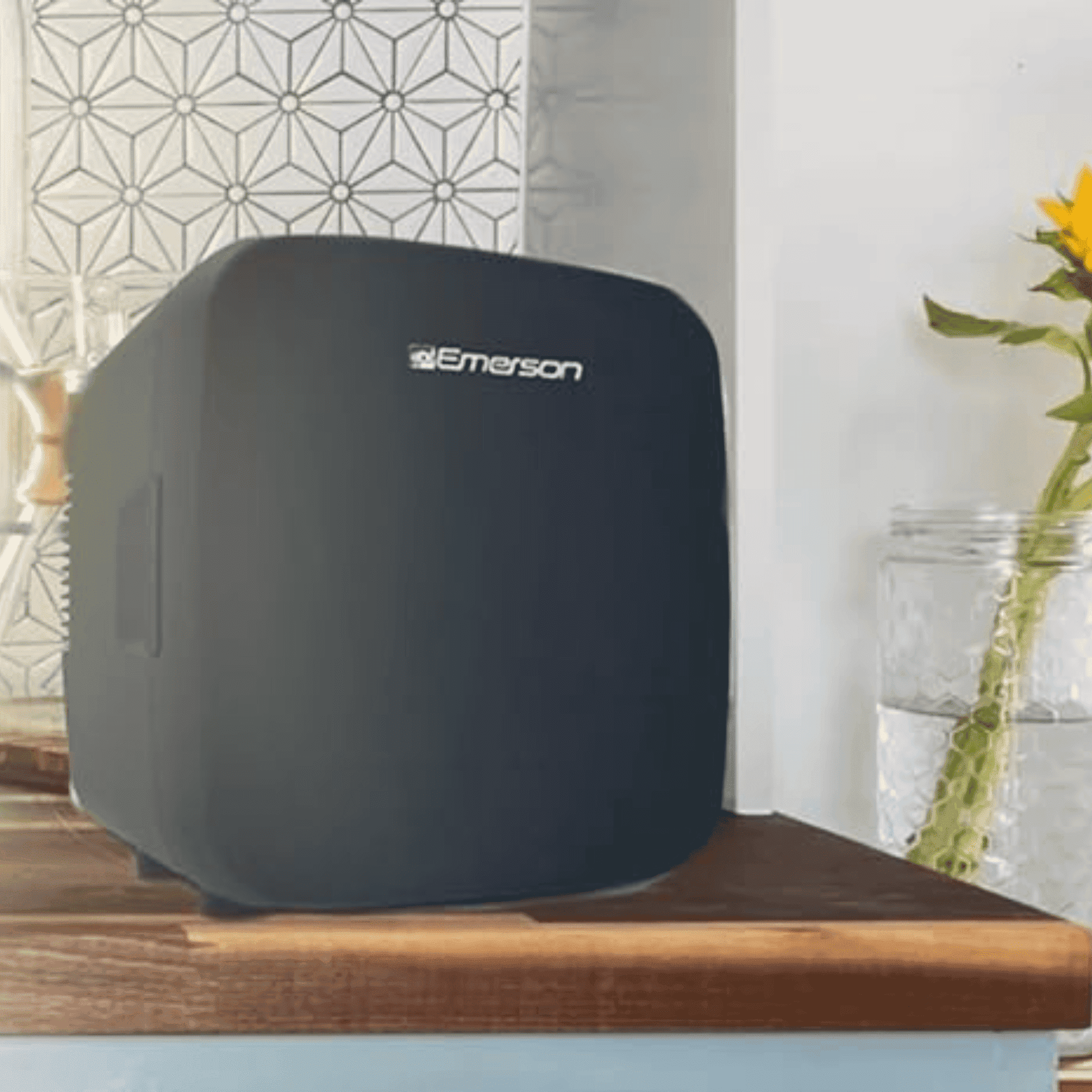 Emerson's 9-liter mini fridge is the perfect solution for storing up to 12 cans (12 oz) of snacks and beverages. It features a thermoelectric cooling system that operates quietly and cools to 28-30 degrees F below the ambient temperature. The fridge is equipped with a locking latch mechanism, and a space-saving design, and it comes with an AC/DC power adapter. Get yours today and enjoy chilled drinks and snacks anytime, anywhere! The compact size of the mini fridge allows it to fit virtually anywhere, making it a convenient addition to any room.