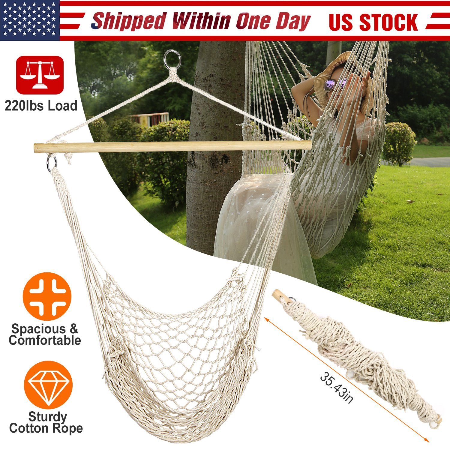 Hammock Chair Hanging Rope Seat Swing w/ Wooden Stick 220lbs Load for Patio Yard Porch Outdoor Bedroom Indoor