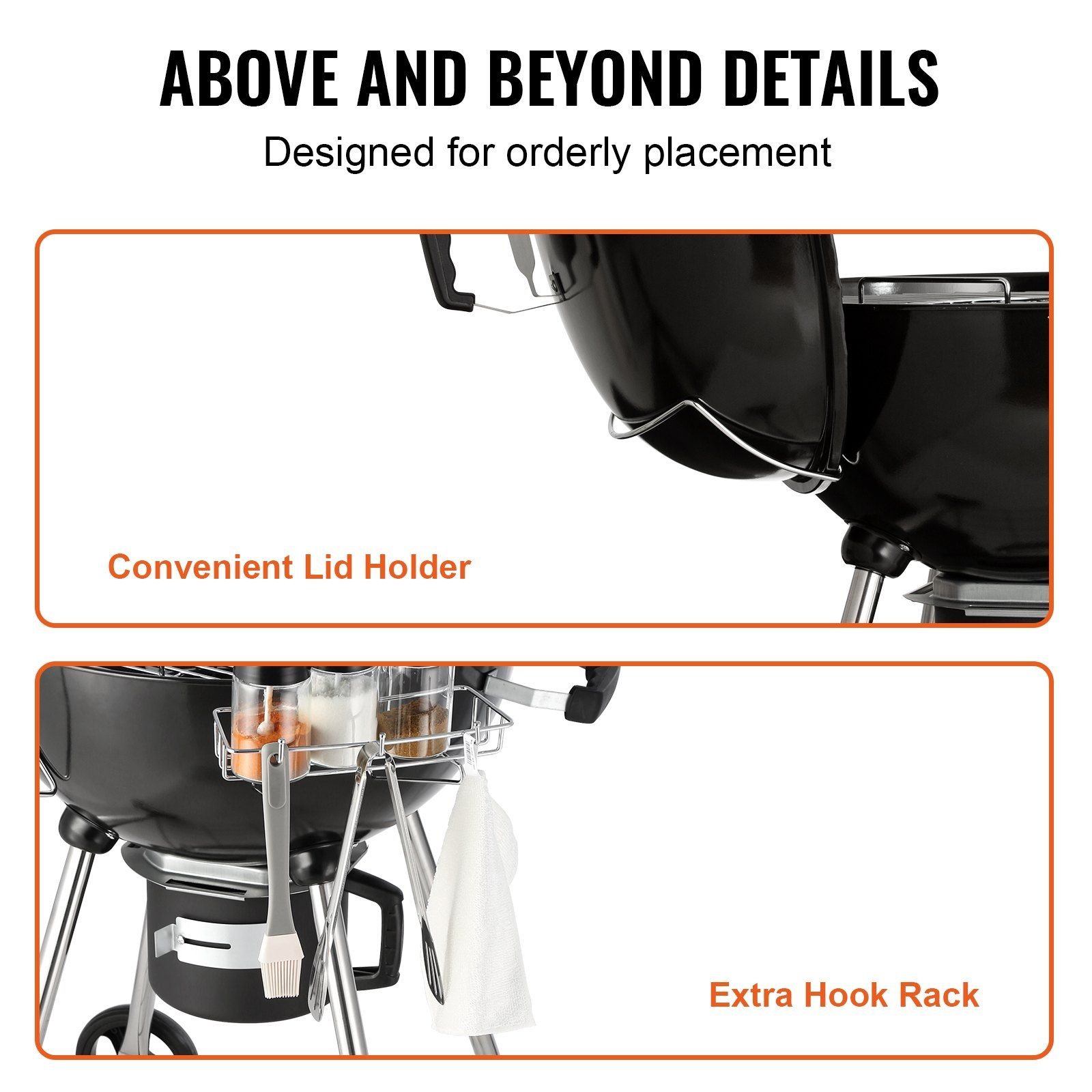 4.Orderly Placement: The hassle of outdoor cooking is no longer a challenge! With lid holder and hook rack, you can avoid placing the lid on the ground, and expand your grilling surface and keep all your ingredients and condiments close at hand.