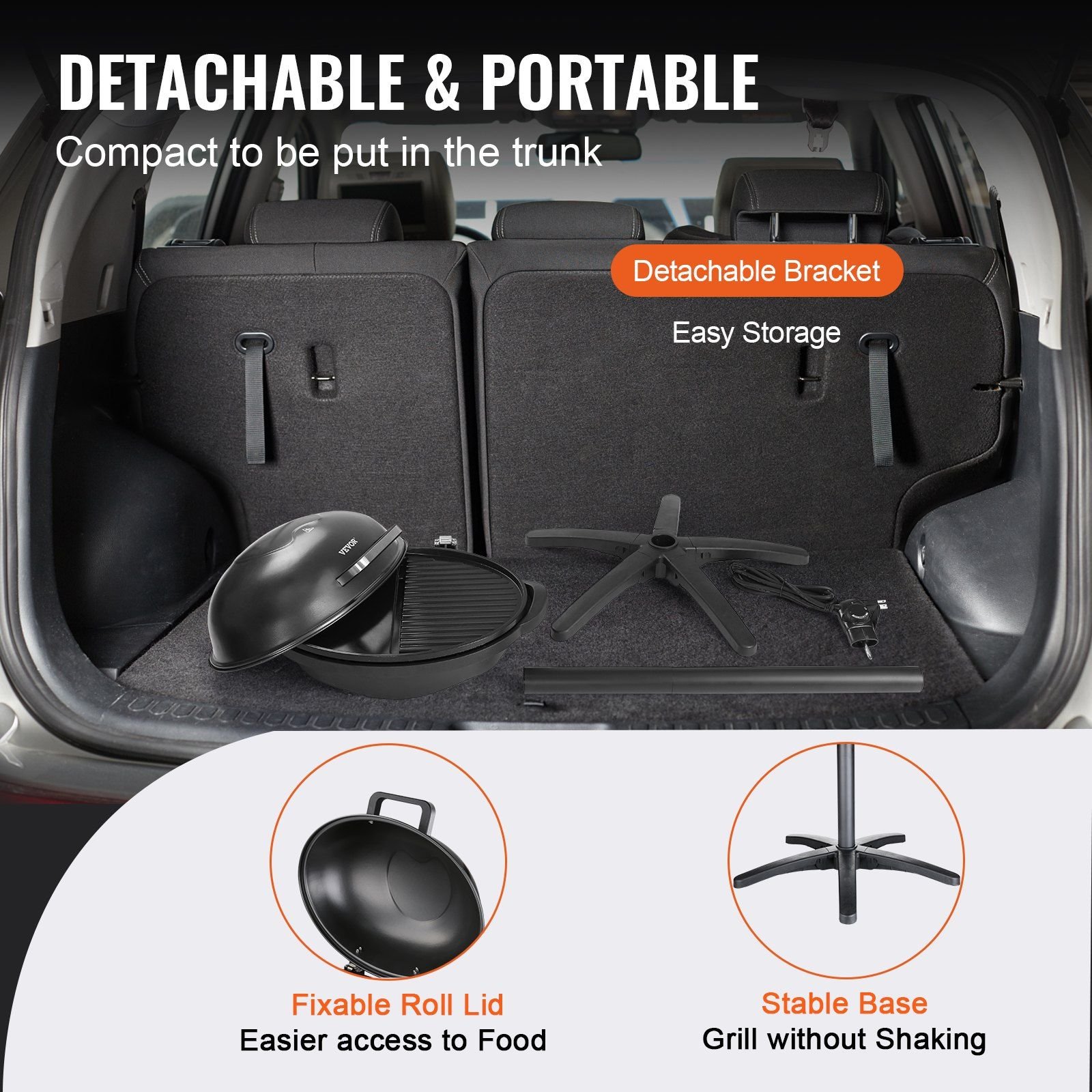 4.Made for your Convenience: This grill features a convenient drawer-style grease tray that filters away excess oil, keeping your hands clean. Fixable roll lid is both fixed and removable, making it easy to access your food. And the removable support stand allows for compact storage, convenient to transport in your car's trunk for outdoor activities. The sturdy base ensures stability and prevents wobbling during grilling, providing a safe and enjoyable cooking experience.
